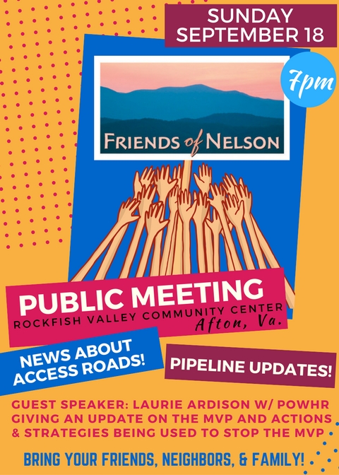 Join Friends of Nelson at 7 p.m. on Sunday September 18, 2016, at RVCC, for the latest on ACP opposition efforts and news about access roads. Our guest speaker will be Laurie Ardison of Protect Our Water Heritage and Rights. POWHR is an umbrella organization for groups of activists from counties primarily but not exclusively along the proposed Mountain Valley Pipeline corridor. Laurie will be giving us an overview of MVP opposition, strategy and updates. Bring your friends, neighbors and family!